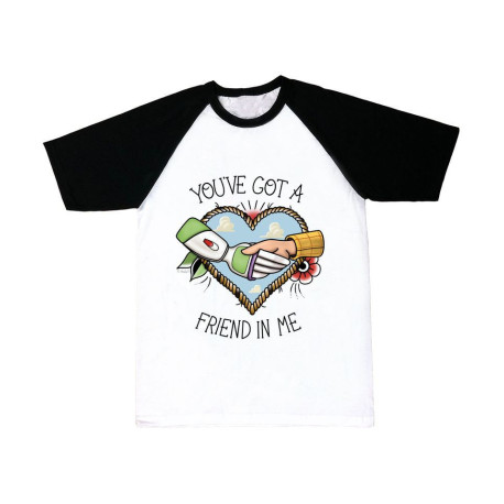 É uma t-shirt estilo basebol, com mangas de cor diferente, feita em 100% algodão. Mas o que a torna tão especial é o seu design estilo tatuagem old school em que se lê "You've got a friend in me" com as mãozinhas do Buzz Lightyear e do Woody a tremer.