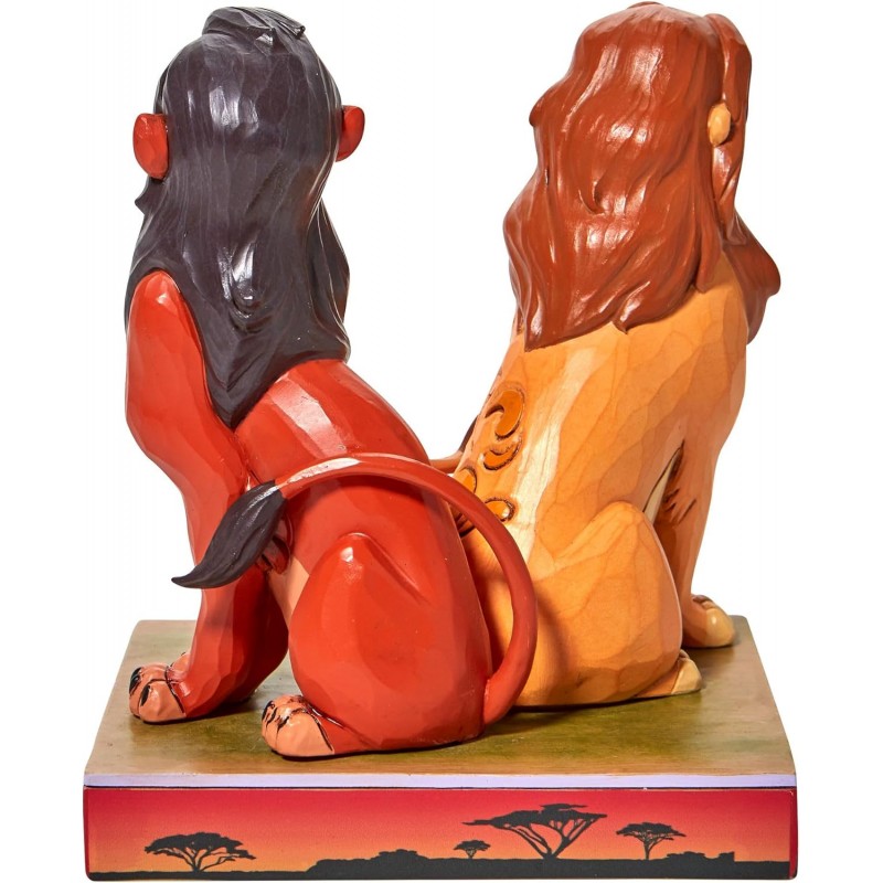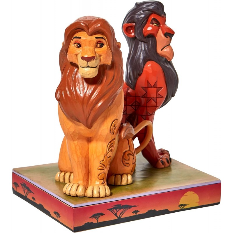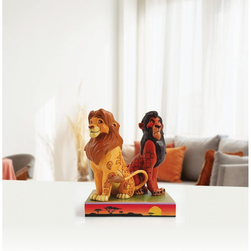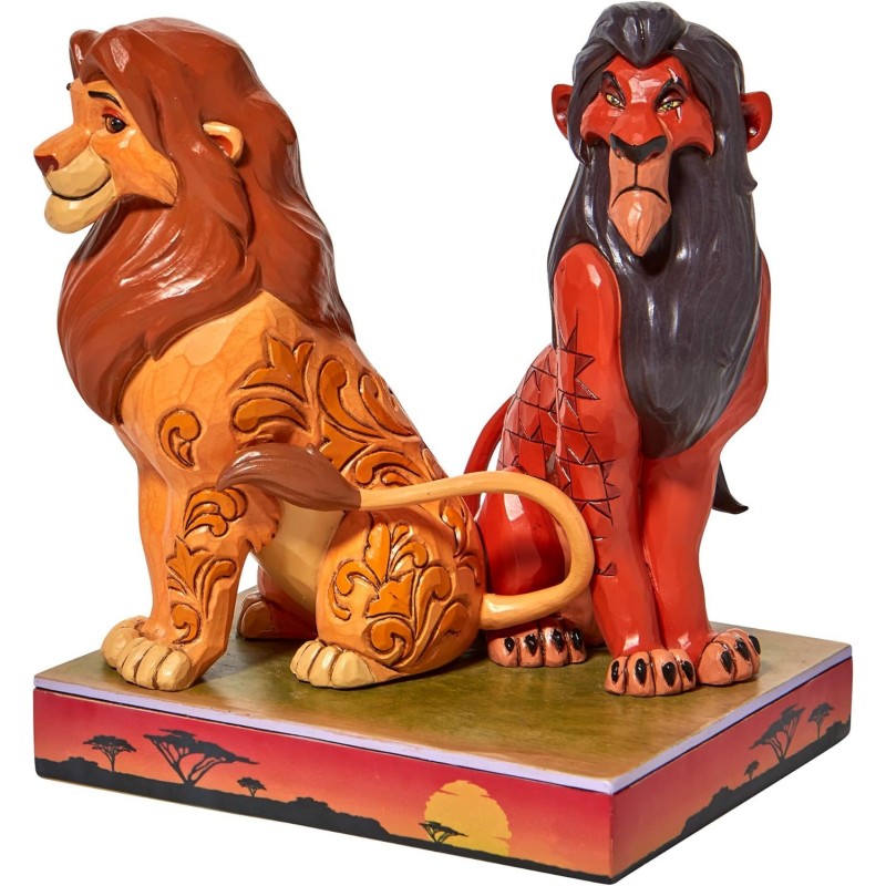 A figura mostra Simba e Scar sobre uma base colorida que evoca as paisagens do amanhecer africano. Cada detalhe, desde os tons quentes de Simba até a cor intensa de Scar, é trabalhado de forma primorosa para capturar a essência desses personagens memoráveis.
