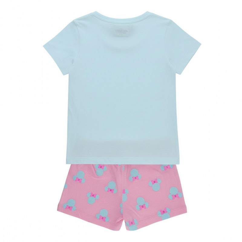 A cor azul claro da camiseta complementa perfeitamente os shorts rosa, adornados com padrões de silhueta da Minnie. Este conjunto é ideal para meninas de 3 a 6 anos, garantindo um ajuste confortável e liberdade de movimento.