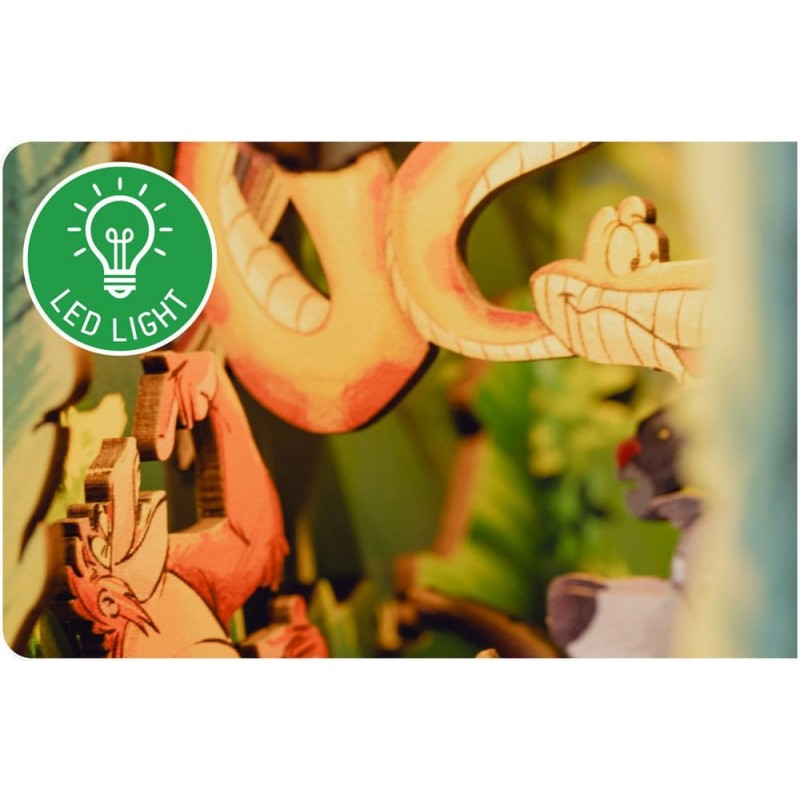 Descubra um mundo mágico na sua estante com o Book Nook Disney: O Livro da Selva. Este encantador kit da Revell permite-lhe construir um mini diorama de 23 cm de altura, capturando a essência deste conto clássico. As peças de madeira de alta qualidade são cortadas a laser para uma montagem precisa, e a deslumbrante iluminação LED adiciona um toque cativante a qualquer espaço.