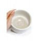 Está fabricado en Japón en cerámica de alta calidad y tienen una forma irregular y orgánica. Es de un color blanco apagado que deja entrever la cerámica color arena que hay debajo. Una pieza muy muy japonesa. Mide 13cm de diámetro y 7,5 de altura, parece grande pero no hay que llenarlo mucho para batir un buen té matcha. También puedes batirlo aquí y pasarlo a las tazas o cuencos en los que lo vas a tomar.
