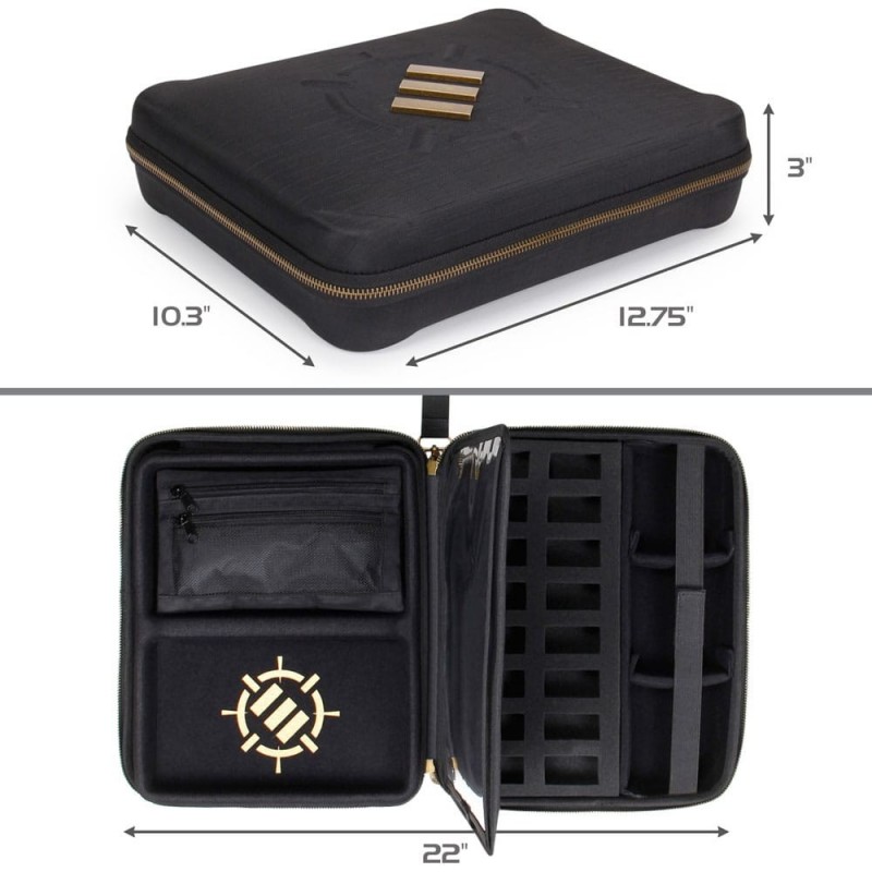 Os detalhes em metal bronzeado adicionam um toque de distinção, tornando este estojo um presente perfeito para um fã de RPG ou para um mimo pessoal. Eleve sua experiência de jogo com este organizador feito sob medida para cada aventura.