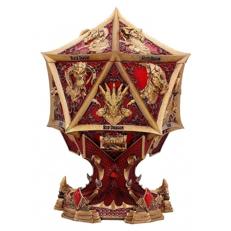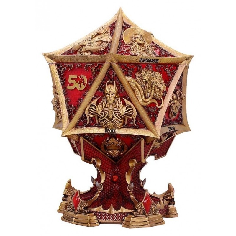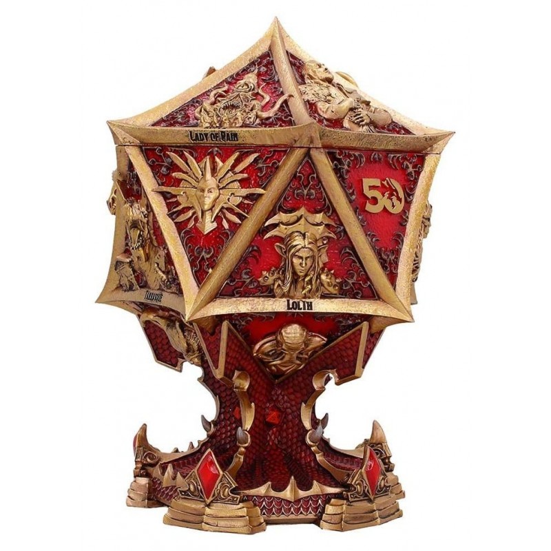 Seu design é impressionante, com tons dourados e vermelhos que destacam figuras icônicas do universo D&D, como Lolth e Vecna, perfeitamente detalhadas em sua superfície. A estrutura lembra um dado de várias faces, embelezando qualquer prateleira ou mesa.