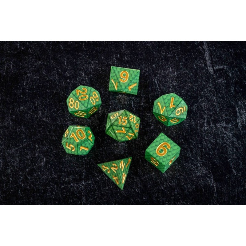 Melhore suas aventuras de mesa com o Conjunto de Dados Dragon Storm Escamas de Dragão Verde. Estes dados de silicone oferecem uma experiência única de lançamento com suas bordas afiadas para jogadas precisas e um leve ressalto. Inspirado nas lendárias escamas de dragão, o design verde com números dourados é perfeito para se imergir em jogos de RPG.