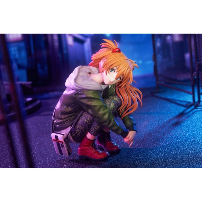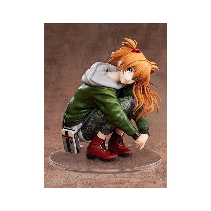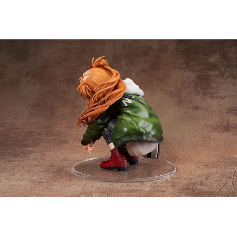 Asuka é representada em uma pose dinâmica, vestindo uma jaqueta estilo parka verde, calças com design gráfico e botas vermelhas. Sua expressão calma e o movimento do cabelo acrescentam realismo e vitalidade. A figura fica em uma base que proporciona estabilidade, ideal para exibição em qualquer coleção.