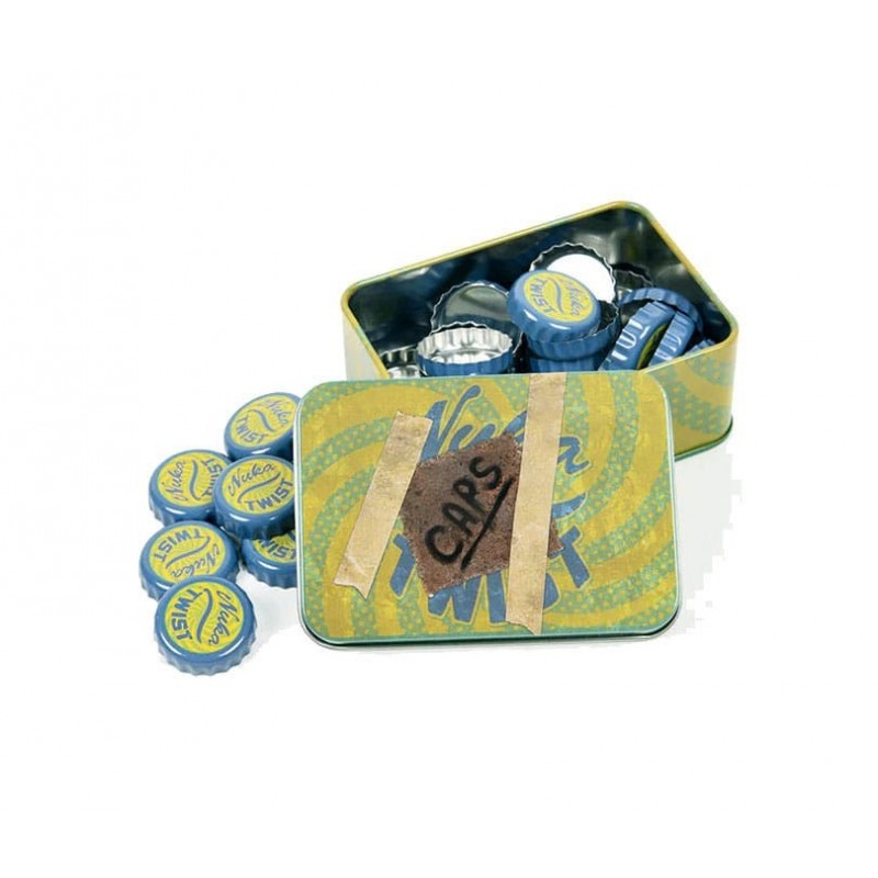 Este conjunto de réplicas colecionáveis de Fallout inclui uma lata atraente, contendo 20 tampinhas Nuka Twist. A lata, medindo 10 x 7 x 4 cm, é desenhada em verde e amarelo com padrões geométricos e o logo de Fallout, capturando o estilo pós-apocalíptico do jogo.