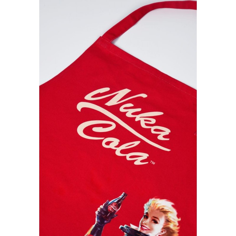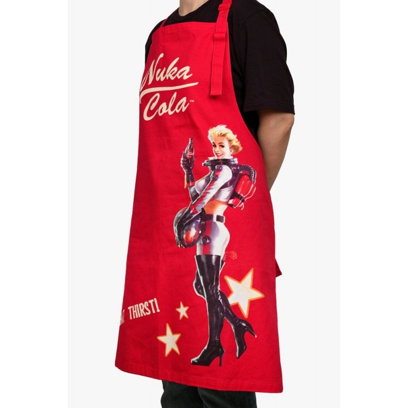 O avental vermelho vibrante destaca o logotipo icônico da Nuka Cola e uma ilustração de personagem feminino, característica do universo retro-futurista de Fallout. Seu design único é ideal para quem aprecia uma mistura de estética vintage e temas pós-apocalípticos.