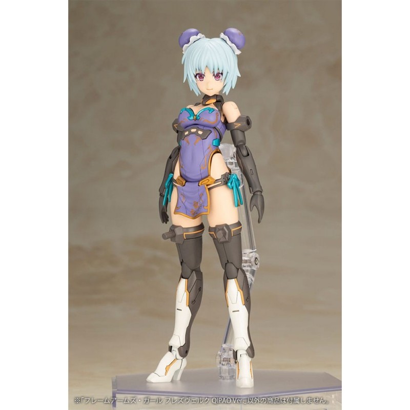 Descubra o incrível Kit de Modelismo da Frame Arms Girl Hresvelgr em sua versão Qipao. Este modelo de 17 cm é uma representação detalhada e colorida da série Kotobukiya. Com cabelo azul claro e olhos marcantes, a figura destaca-se pelo traje roxo com detalhes dourados, complementados por acessórios turquesa. O conjunto inclui uma grande espada e várias peças de armadura que completam o visual robótico e estilizado.