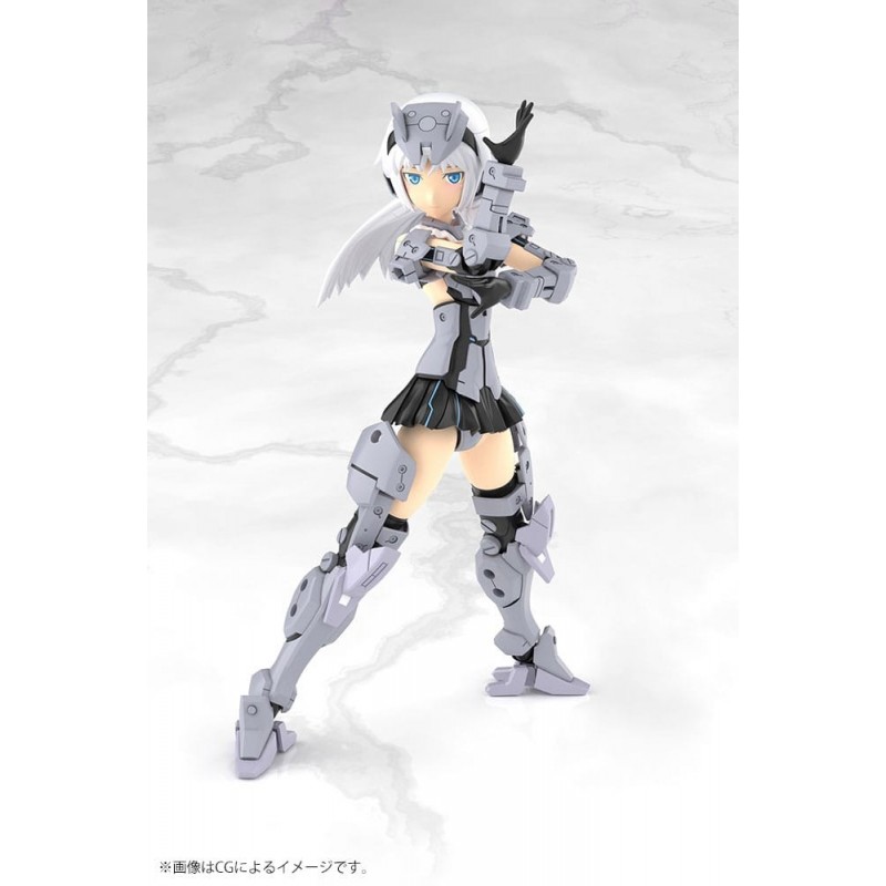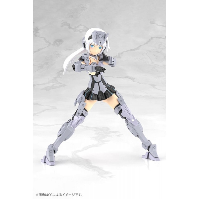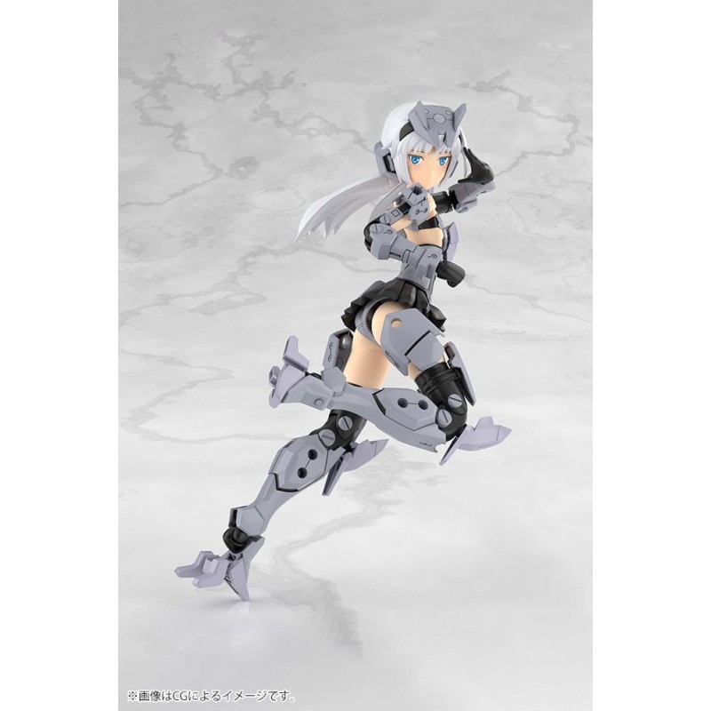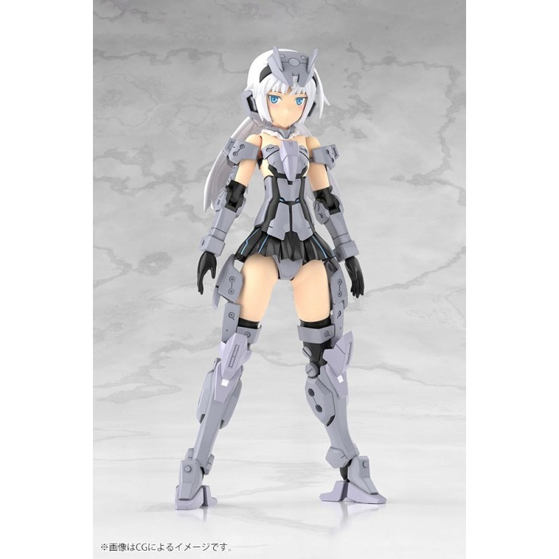 Descubra o fascinante Kit de Modelismo Frame Arms Girl Architect, uma maquete em escala de 25 cm, produzida com a qualidade meticulosa da Kotobukiya. Esta figura apresenta um design detalhado com um esquema de cores cinza predominante, realçado por tons pretos e azuis que adicionam profundidade e estilo.