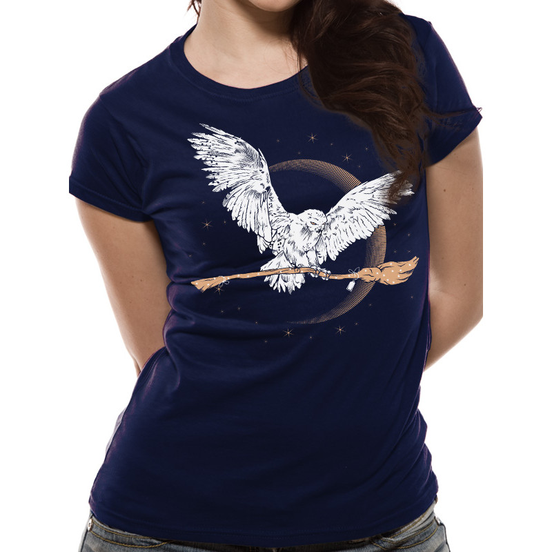 Se trata de una camiseta oficial de gran calidad y fabricada con una excepcional calidad en material, gráficos y acabados. Pero lo mejor es su fantástico diseño, con un precioso estampado protagonizado por la lechuza de Harry Potter, Hedwig, sin duda uno de los animales más bellos de la saga, con sus alas desplegadas y además sobre una escoba voladora, en un detallado dibujo sobre un azul marino realmente elegante. Está diseñada con un corte especial para chica para que quede muy bien.
