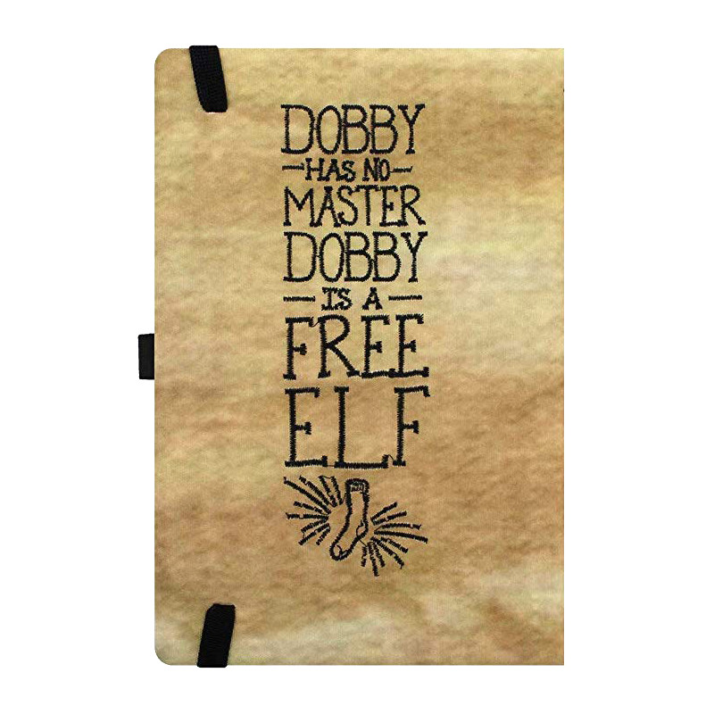 Una libreta que destaca nada más la ves por el cuidado diseño de su portada, que está acabada en tela y tiene los dibujos cosidos en hilo primorosamente, con la silueta del elfo más famoso de la saga, Dobby, y el texto Dobby has no master, Dobby is free elf, que recuerda ese mítico momento en el que es liberado por Harry. Y no te pierdas su interior, con un dibujo del calcetín que le libera, en la esquina de cada página.