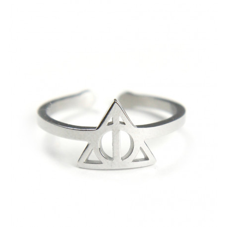 Se trata de un anillo con un significado muy especial, diseñado para que lleves siempre contigo los tres objetos mágicos más poderosos jamás creados! Y es que este anillo de acero tiene la forma del símbolo de las tres Reliquias de la Muerte: la Varita de Saúco, la Piedra Filosofal y la Capa de la Invisibilidad. Tendrás una perfecta reproducción de esta famosos símbolo triangular, tal y como aparece en las películas de Harry Potter.