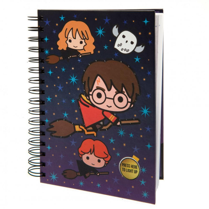 Y es que en la portada de esta libreta podemos a los principales protagonistas de la saga, Harry, Ron y Hermione, montados en sus escobas, junto a Hedwig, y con unos dibujos muy kawaii y divertidos, que te enamorarán nada más los veas. Y por si su diseño no fuera ya suficientemente chulo, además esta libreta tiene luz, así que cuando aprietas en un punto de la portada, esta se ilumina en varios puntos.