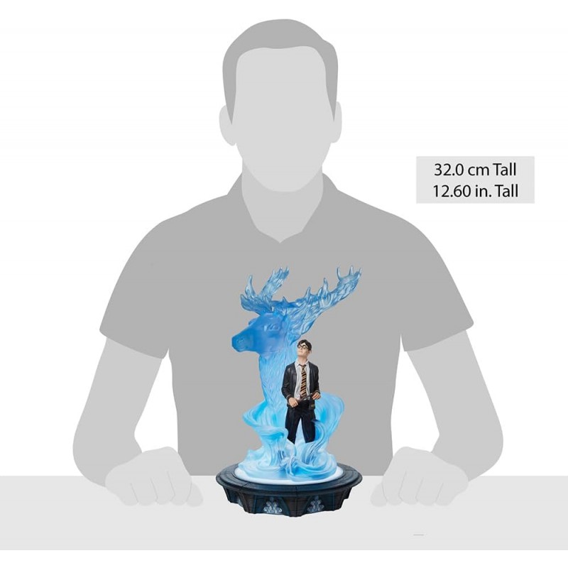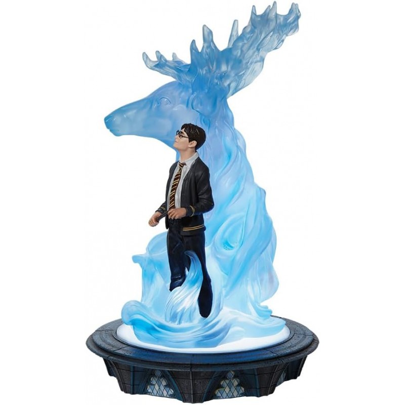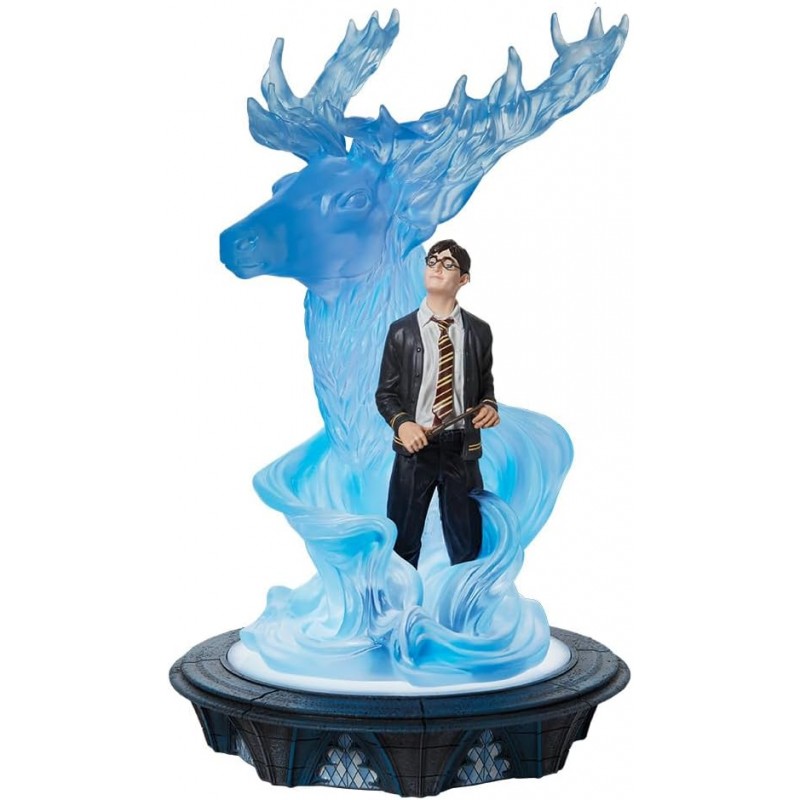 A figura de Harry Potter com seu Patronus, um cervo, é uma representação icônica do mundo mágico. Esta figura captura a essência do momento em que Harry conjura seu Patronus na Floresta Proibida para se defender dos Dementadores. O design mostra Harry ao lado de um impressionante cervo etéreo em tons azuis, simbolizando proteção e coragem.