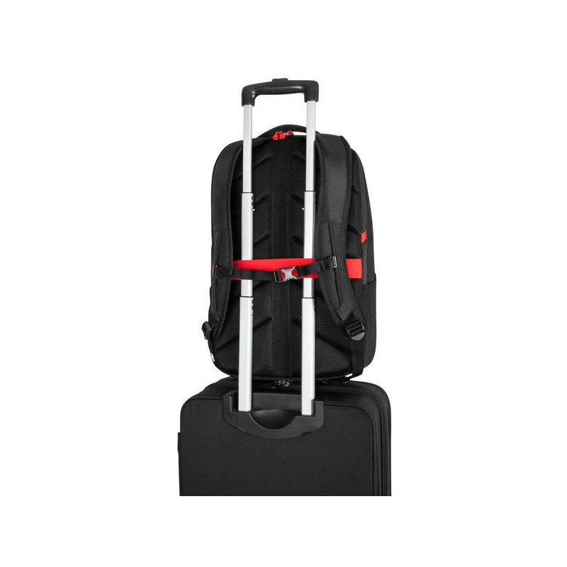 A Mochila Targus Strike II Gaming é o acessório perfeito para gamers que buscam funcionalidade e estilo. Projetada para laptops de até 17,3 polegadas, esta mochila combina um design monocromático elegante em preto com detalhes em vermelho, proporcionando um visual moderno e dinâmico.