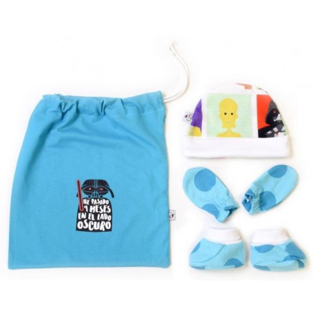 Se trata de un set compuesto de gorrito, manoplas, patucos y bolsita multiusos, ideal para llevar al bebé de lo más elegante a su salida del hospital. Ha sido diseñado y fabricado en España con algodón de gran calidad con certificado de calidad Oeko-tex®. Pero sin duda lo mejor es su diseño, con un dibujo muy divertido del legendario Darth Vader y el texto: He Pasado 9 meses en el Lado Oscuro. Es un kit en talla única (talla 0).