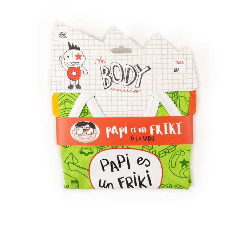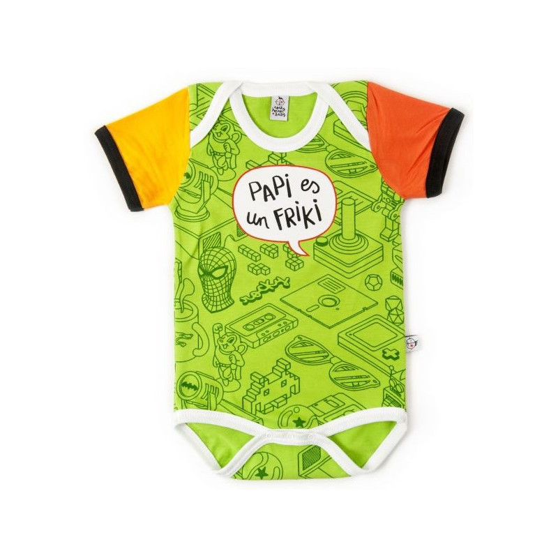 Se trata de un body diseñado y fabricado en España con algodón de gran calidad con certificado de calidad Oeko-tex®. Pero sin duda lo mejor es su diseño, lleno de color y con unos dibujos geniales con referencias a videojuegos, series o superhéroes del que todos los geeks o frikis somos un poquito fans (o un muchito incluso), junto con la frase Papi es un friki.