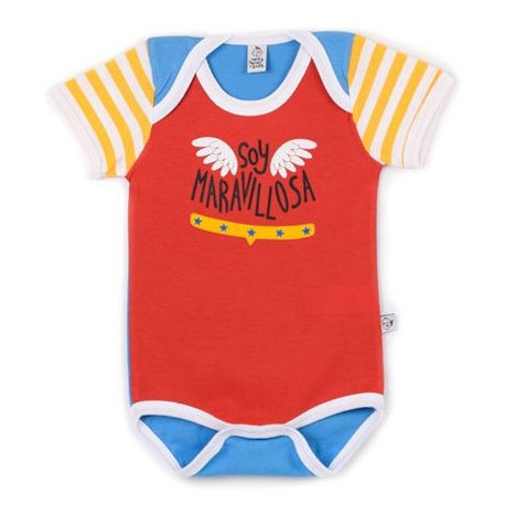 Se trata de un body diseñado y fabricado en España con algodón de gran calidad con certificado de calidad Oeko-tex®. Pero sin duda lo mejor es su diseño, lleno de color, con claras referencias al icónico traje de Wonder Woman y el texto Soy Maravillosa.
