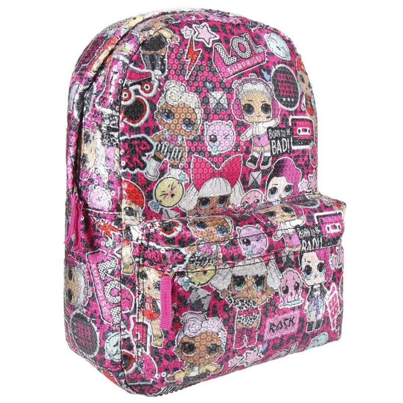 Se trata de trata de una genial mochila que mide en torno a 30 x 40 x 12 cm y que puedes llevar cómodamente porque su peso es ideal. Es un producto con una extraordinaria calidad tanto en materiales como en acabados, con licencia oficial y su diseño es realmente divertido, en ese color rosa tan propio de las muñecas LOL Surprise, sobre el que vemos la imagen de varias de estas muñecas, y con un acabado de lentejuelas realmente original.