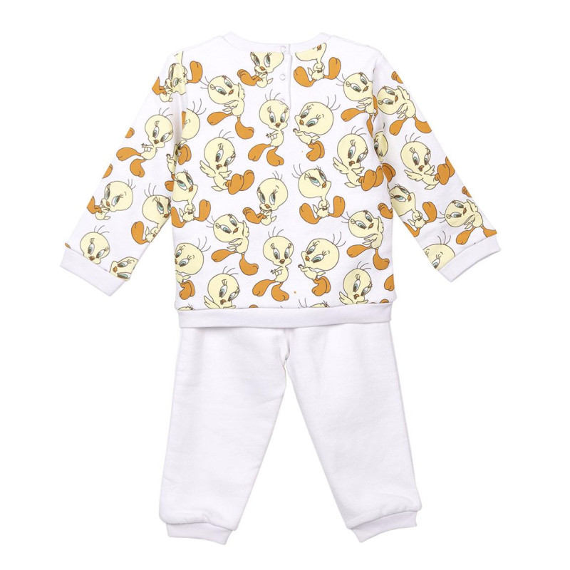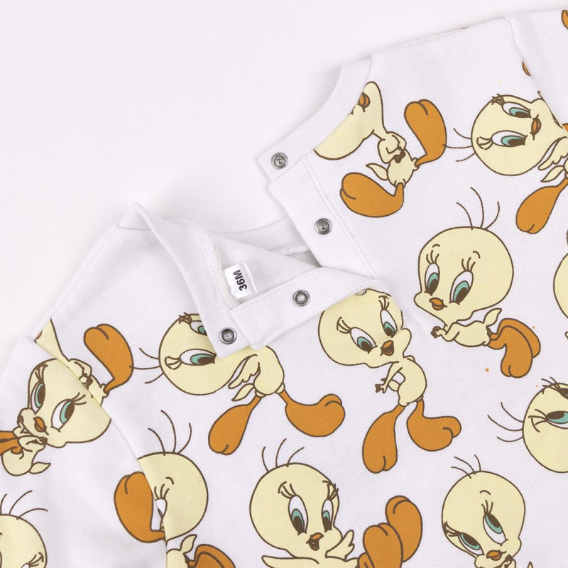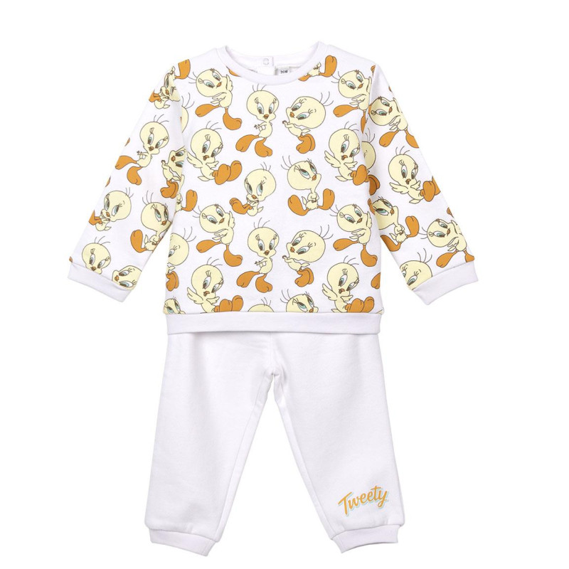 Este fato de treino é um presente original e útil para os pequenos fãs dos Looney Tunes. Com o seu adorável estampado Piu-Piu, capta a essência e a diversão destas personagens tão queridas. Para além de ser One Piece de vestuário versátil e confortável, é ideal para qualquer ocasião, quer seja para o dia a dia ou para um evento especial.