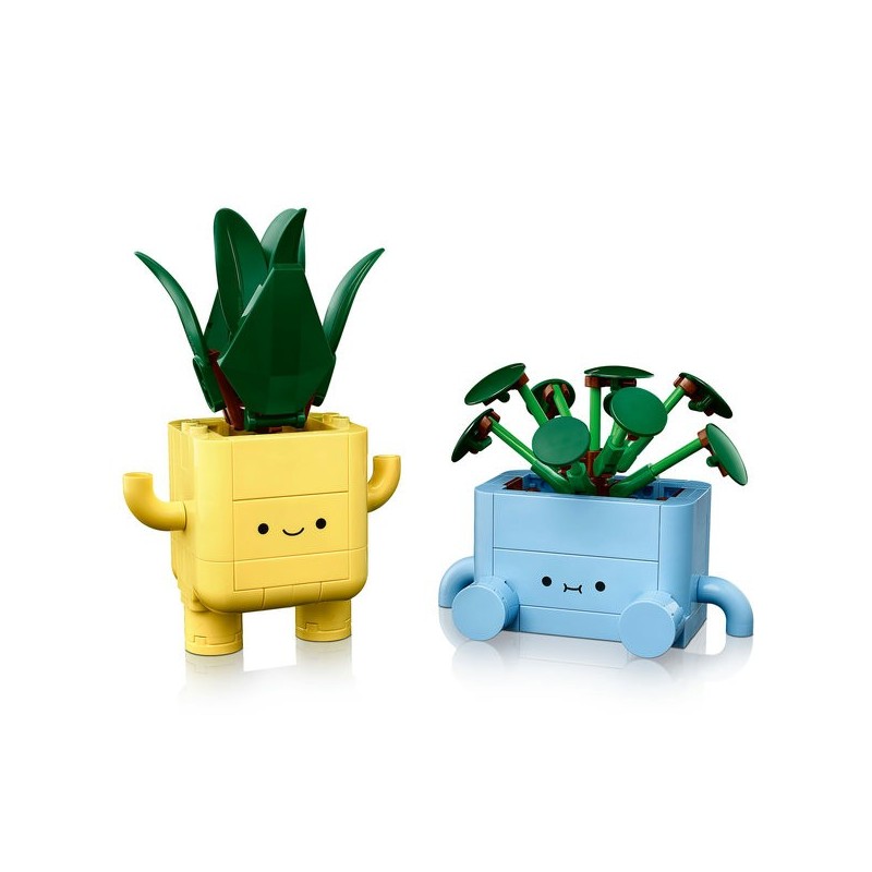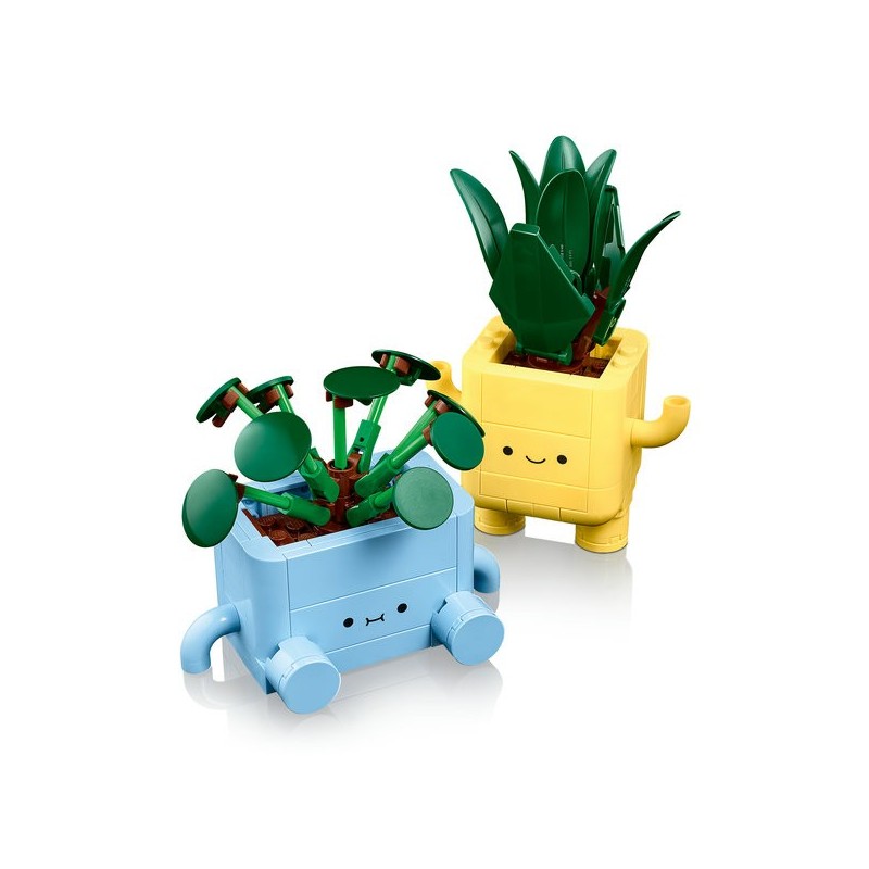 O conjunto LEGO® Botanicals Plantas Felizes oferece uma oportunidade maravilhosa para crianças a partir de 9 anos soltarem sua criatividade ao construir duas adoráveis plantas decorativas. Este conjunto inclui uma jovem dracena em pé e uma jovem pilea sentada, cada uma com vasos coloridos, um amarelo e outro azul, decorados com carinhas intercambiáveis que acrescentam um toque de humor e personalização.