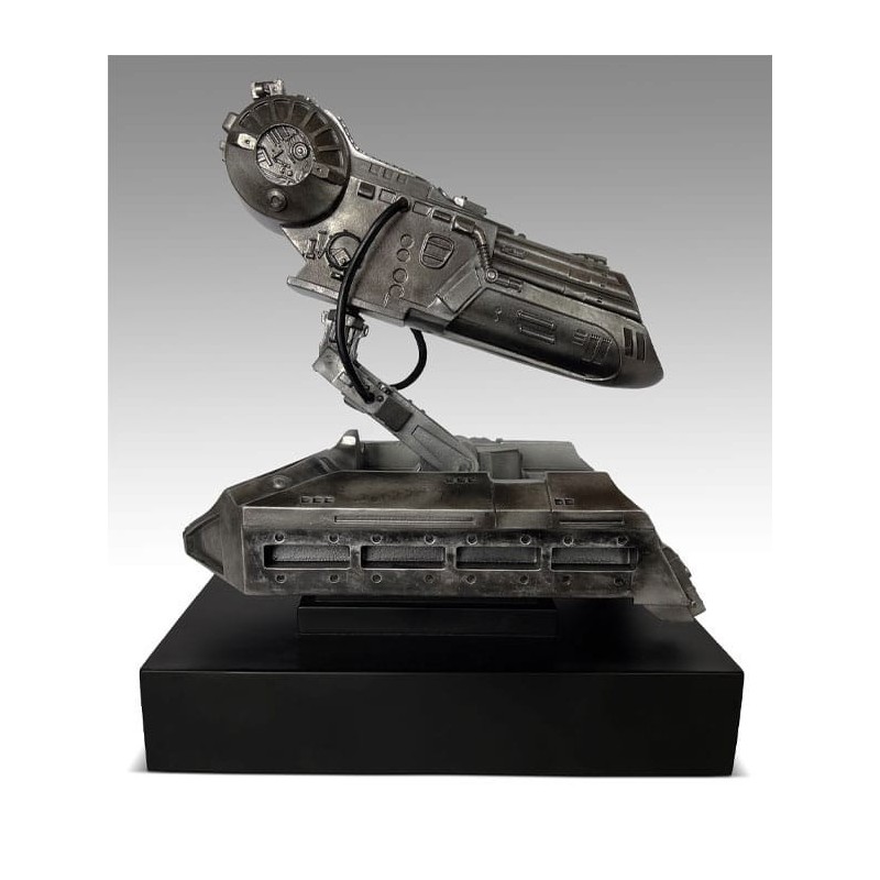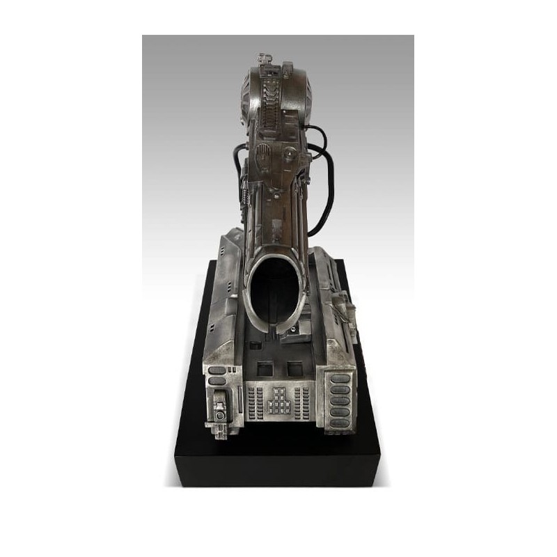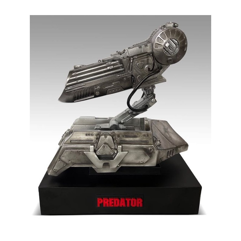 A estrutura do canhão apresenta um acabamento metálico que lhe confere uma aparência robusta e realista. Montada sobre uma base discreta que destaca o nome do universo Predator, esta réplica está destinada a ser exibida com orgulho em qualquer coleção.