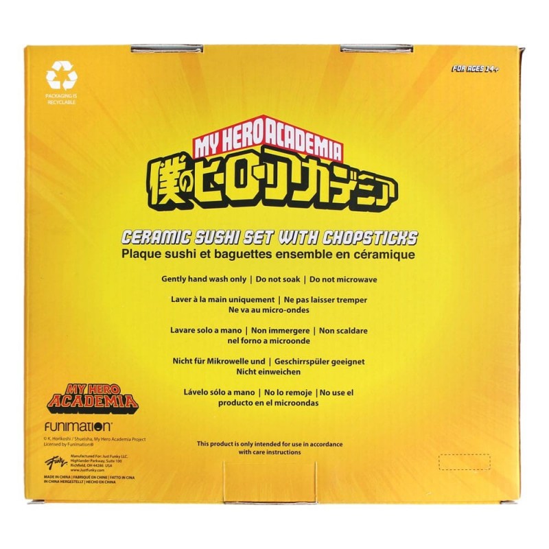 Merque-se no mundo de My Hero Academia com este elegante conjunto de sushi. Inclui uma bandeja de cerâmica de 20,6 x 14 cm, ideal para exibir suas criações culinárias, e um prato para molho de soja de 10 x 7 cm com o design distinto da UA. Os hashis de 17,8 cm completam este conjunto perfeito. Fabricado pela Just Funky, este conjunto é um presente original para os fãs de anime. Não é adequado para micro-ondas nem lava-louças.
