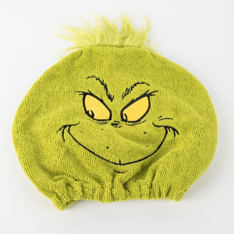 Descubra a toalha para cabelo The Grinch, perfeita para secar o cabelo de forma rápida e divertida. Fabricada em 100% poliéster, esta toalha verde apresenta o rosto icônico de The Grinch com sua expressão travessa característica. Seu design estilo turbante mantém o cabelo no lugar durante a secagem, proporcionando conforto e estilo.