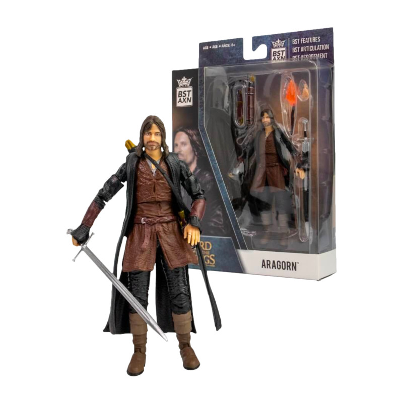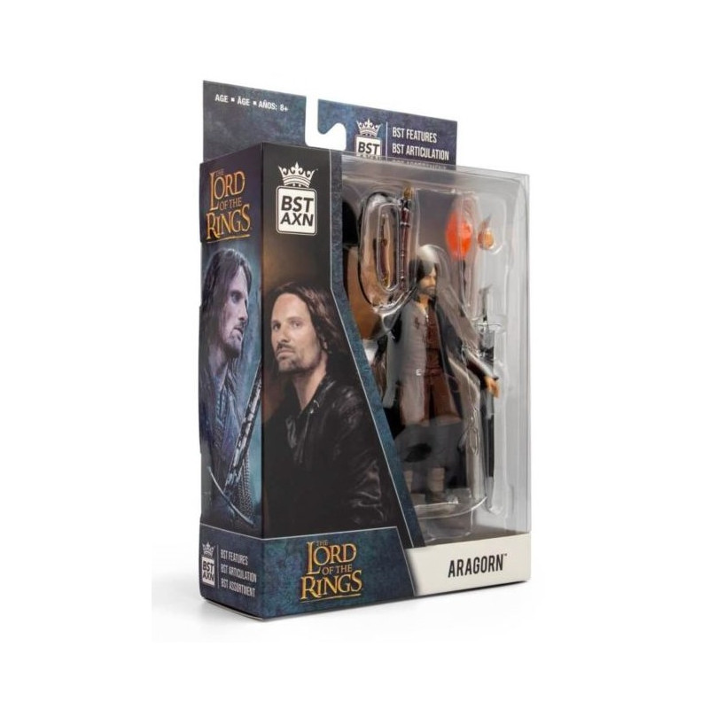 Esta é uma figura de Aragorn com um total de 31 pontos de articulação, bem como uma grande qualidade de acabamentos, detalhes e cores, tanto no rosto como no vestuário ou acessórios que o acompanham, tais como a espada, a tocha, o capuz... Esta figura faz parte da série BST AXN, foi feita de PVC de alta qualidade, e tem aproximadamente 13 cm de altura.