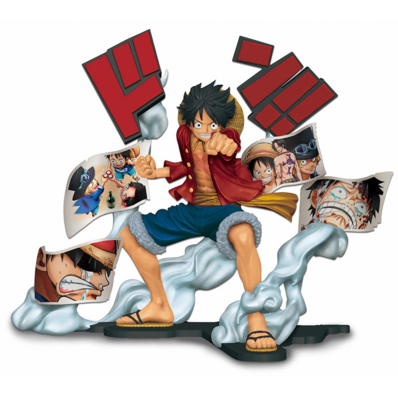 Está fabricada en PVC, mide aproximadamente 20 cm de alto, e incluye una base perfectamente integrada en la figura a modo de diorama. Se trata de una extraordinaria figura inspirada en el gran Monkey D. Luffy a la que no falta un solo detalle, y tiene unos acabados de enorme calidad. Pero lo más sorprendente de esta figura son las escenas reales de One Piece que le acompañan y que hacen de ella una figura original como pocas.