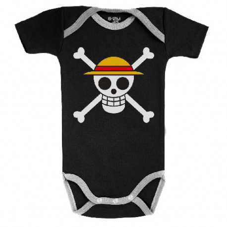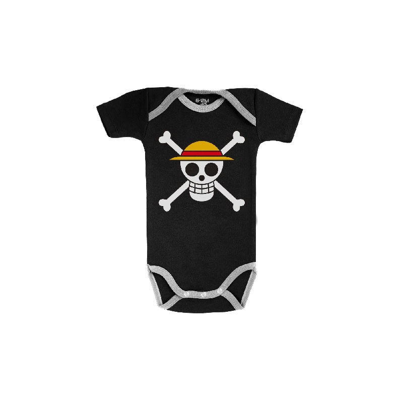 Se trata de un body diseñado y fabricado en Europa con algodón de gran calidad y licencia oficial de One Piece. Pero sin duda lo mejor es su diseño, tal cual la bandera de Luffy, sobre fondo negro y todo y con los ribetitos en gris.