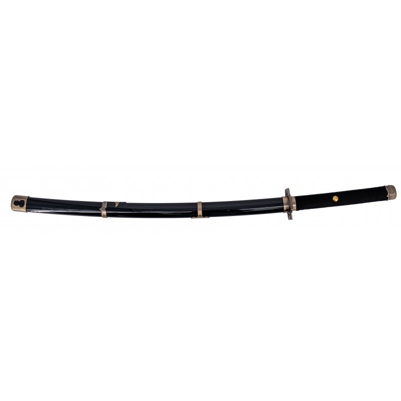 Imerja no universo de One Piece com esta réplica deslumbrante da Katana Yubashiri de Zoro. Medindo um total de 103 cm, esta espada captura a essência do famoso espadachim do anime. A lâmina, feita de bambu, apresenta um acabamento preto com serrilhado acetinado, oferecendo um design autêntico e detalhado. O cabo, envolto em cordão preto, garante uma pegada firme e confortável.