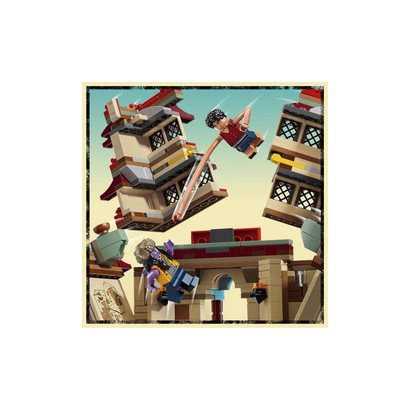 A pagoda principal apresenta funções mecânicas para um jogo dinâmico. Derrube paredes, dispare projéteis e ative zonas ocultas para simular batalhas intensas! Inclui também acessórios temáticos como canhões funcionais e cartazes de "Procurado".