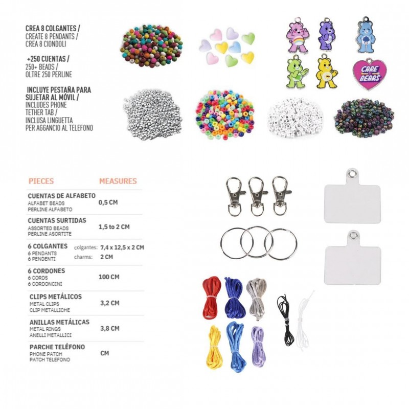 Além disso, o conjunto traz 6 pingentes com figuras dos Care Bears, clipes metálicos e anéis para segurar suas criações. Também incorpora um patch para o telefone, permitindo que você leve seus designs para onde for. Tudo está apresentado em uma caixa colorida e atraente, perfeita para presentear.
