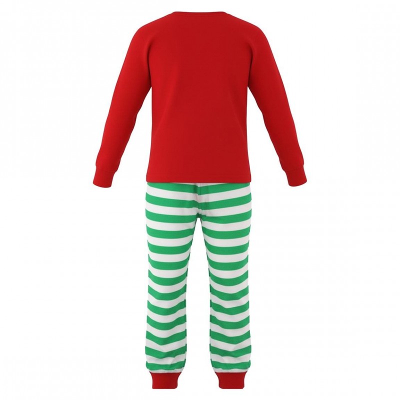 As calças, com listras verdes e brancas, complementam o tema natalino, enquanto os punhos vermelhos nos tornozelos garantem um ajuste confortável. Feito de 60% algodão e 40% poliéster, este pijama oferece maciez e durabilidade, ideal para as noites frias de inverno. Além disso, seu design permite liberdade de movimento para que os pequenos possam brincar e descansar confortavelmente.