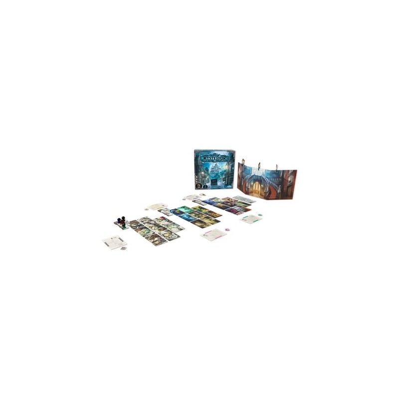 Descubra o jogo de tabuleiro Mysterium, uma experiência imersiva onde você combinará dedução e intuição para resolver um mistério intricado. O design da caixa é intrigante, mostrando uma mansão em meio a uma névoa azul que evoca suspense. Elegante e cheio de detalhes, sua embalagem se torna uma peça de exibição por si só.