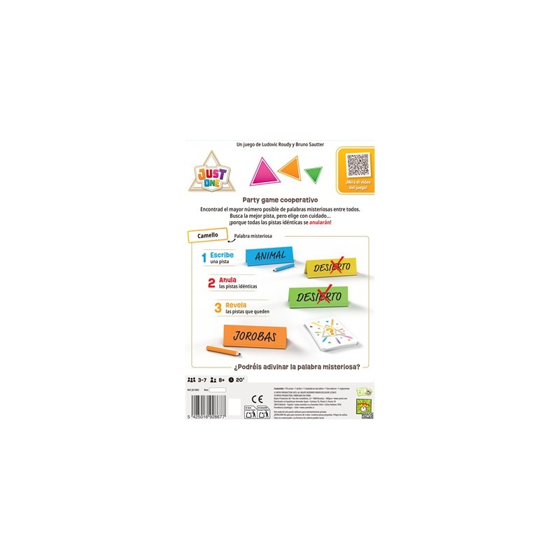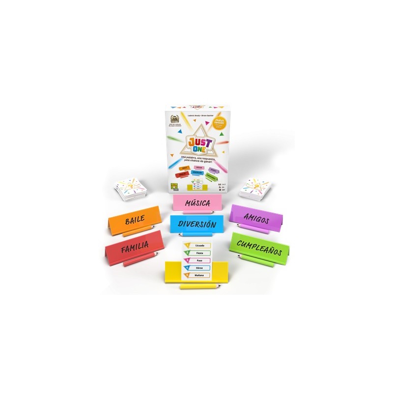 A nova versão de Just One inclui 550 novas palavras, garantindo frescor e rejogabilidade. O conjunto contém 110 cartas, 7 cavaletes com marcadores apagáveis e borrachas, tudo pronto para começar a jogar imediatamente. Editado por Repos Production, é apresentado em espanhol.