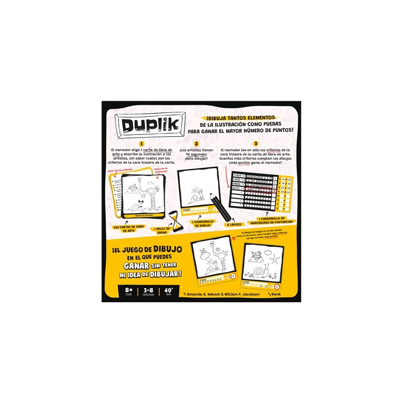 Este jogo inclui 200 cartas de Obra de arte, 8 lápis, um bloco de desenho, um marcador de pontos e uma ampulheta de 90 segundos. Projetado para 3 a 8 jogadores, o Duplik oferece aproximadamente 40 minutos de diversão intensa, perfeito para a família ou amigos.
