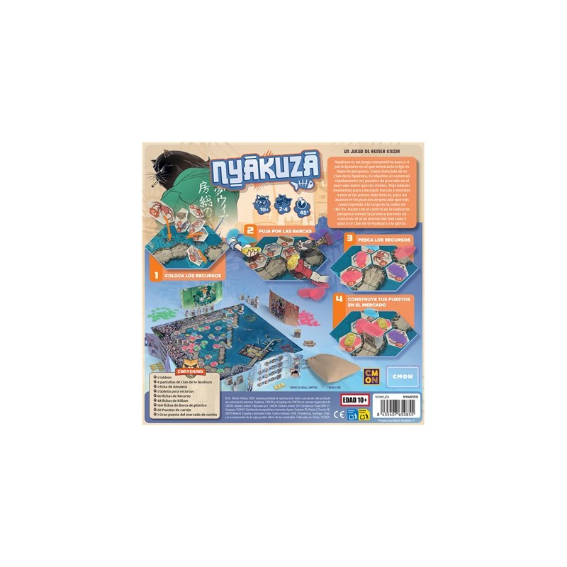 Nyakuza é um emocionante jogo de tabuleiro para 2-4 jogadores, criado por Reiner Knizia. Torne-se o líder de um Clã Nyakuza e construa seu império pesqueiro na baía de Oki-Yo. Combine estratégia e diversão ao colocar recursos, licitar por barcos e pescar as melhores peças. Cada jogador busca ser o primeiro a erguer o Grande posto do mercado, garantindo a vitória de seu clã.