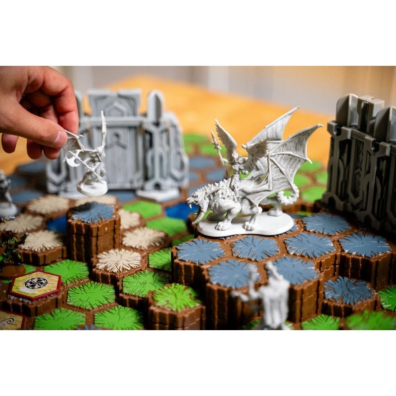 A caixa do jogo apresenta um design visual cativante, com ilustrações de criaturas míticas e guerreiros, capturando a essência do combate estratégico. Inclui 74 peças de terreno, permitindo criações de campos de batalha únicos, e 20 miniaturas finamente detalhadas, cada uma com seu próprio caráter e habilidades especiais.