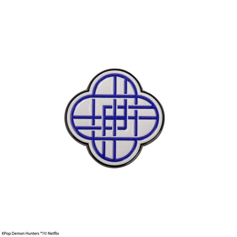 Este elegante pin com licença oficial da série Kpop Demon Hunters, da Cinereplicas, é um acessório indispensável para os verdadeiros fãs. O design apresenta um padrão geométrico intrincado em azul sobre um fundo branco, emoldurado por uma borda preta que o destaca. Perfeito para uso pessoal ou como presente para aquele amigo especial que ama o mundo do Kpop.