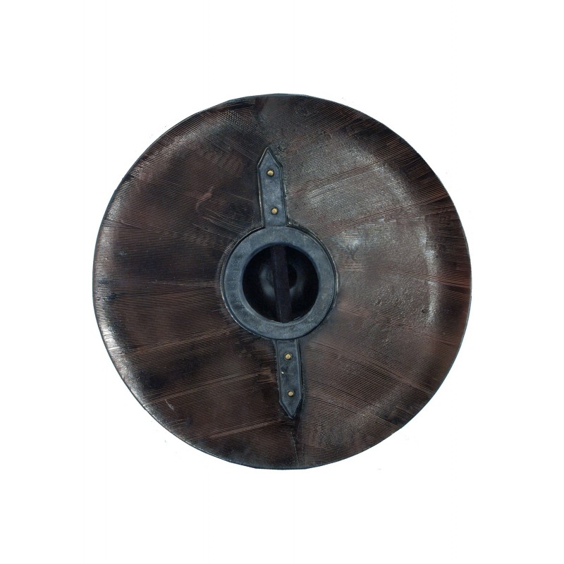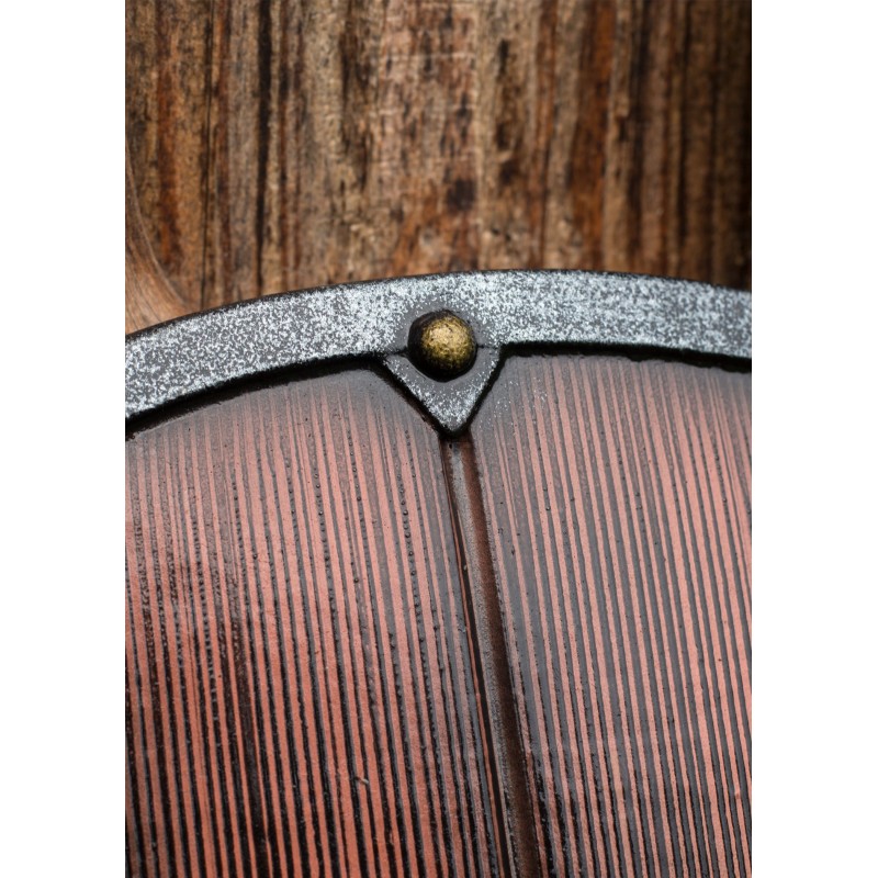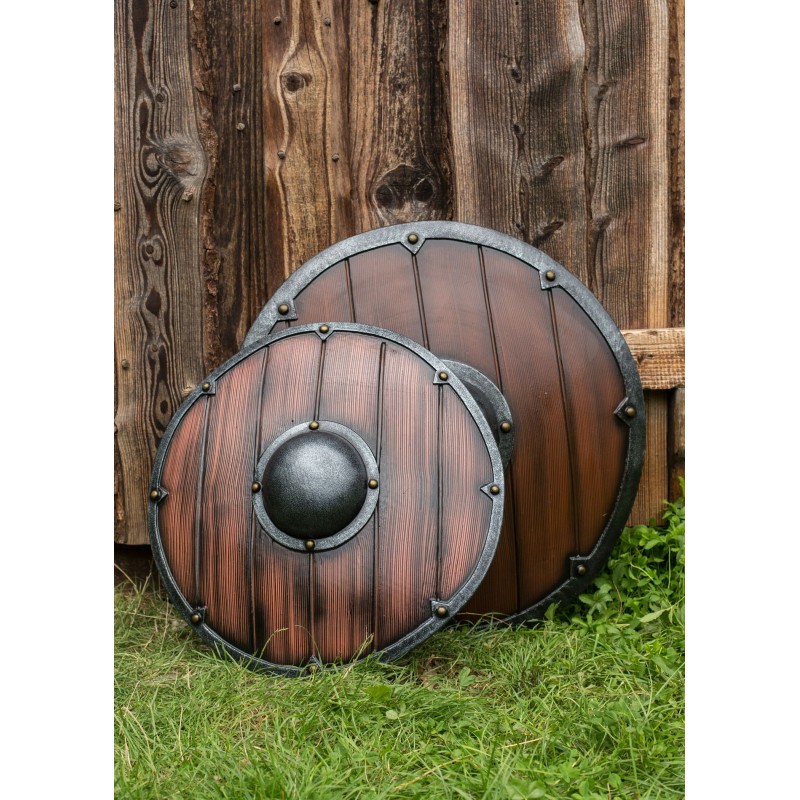 Embarque em uma aventura viking com este escudo viking de 50 cm para LARP da Epic Armoury. Feito à mão e único, é composto por espuma com revestimento de látex, garantindo uma alta segurança para os participantes. O design apresenta um acabamento semelhante à madeira, com detalhes em preto e dourado que se assemelham a rebites metálicos.