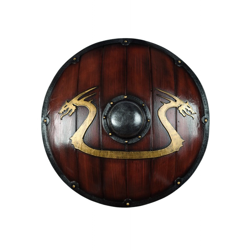 O Escudo Viking Dragão de Madeira da Epic Armoury é uma peça artesanal que se destaca por seu design autêntico e detalhado. Com um diâmetro de aproximadamente 80 cm, este escudo é decorado com um ornamento de dragão dourado sobre um fundo de acabamento em madeira. A borda de cor ferro e o boss central conferem um aspecto robusto, enquanto a empunhadura central montada facilita o manuseio em combate.