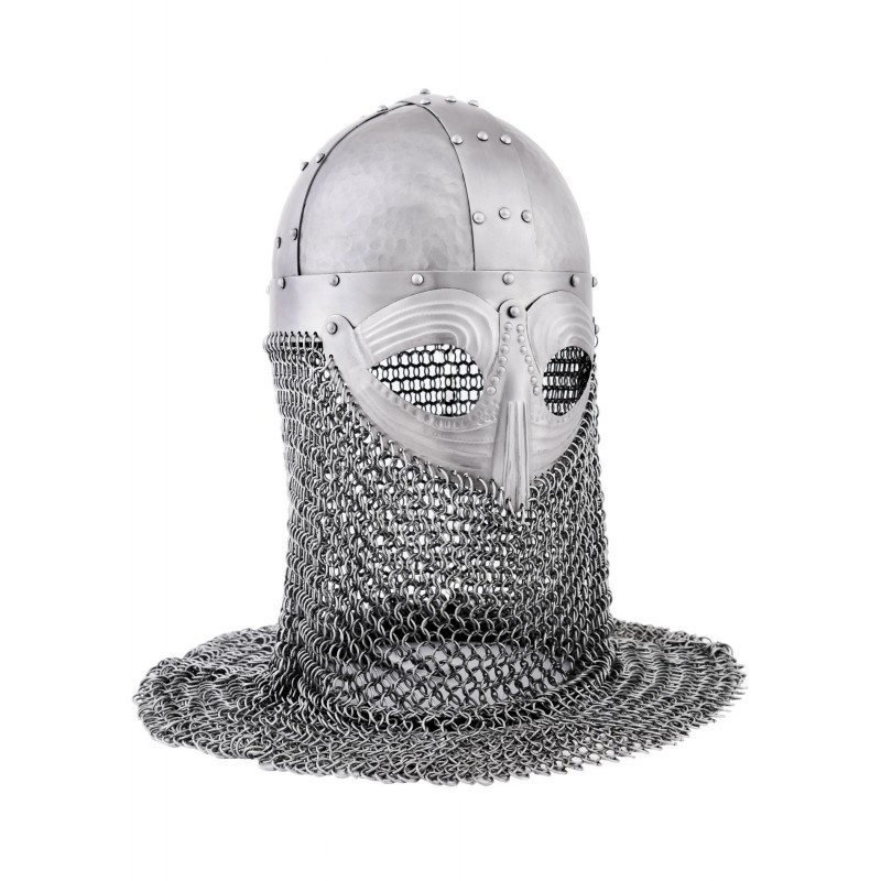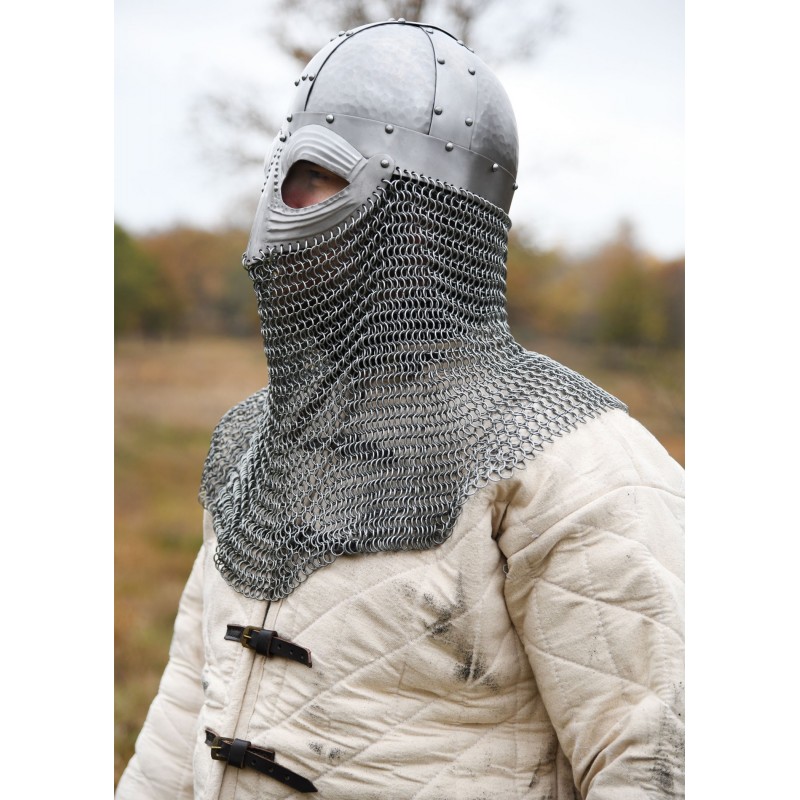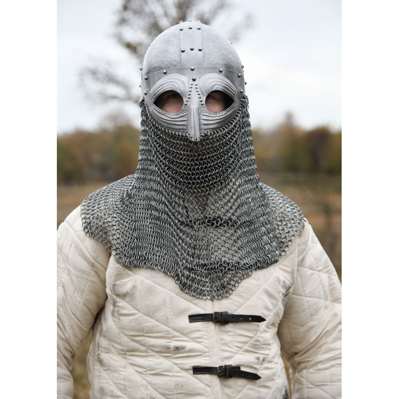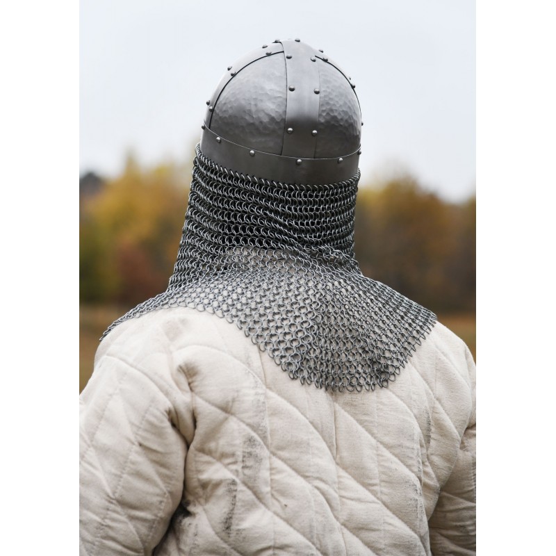 O avental de cota de malha, baseado em um tecido de anéis de aço 4 em 1 de 1,6 mm, protege pescoço e garganta, estendendo-se por 34 cm. Este capacete é ideal para recriações históricas, LARP e exibições de colecionadores.