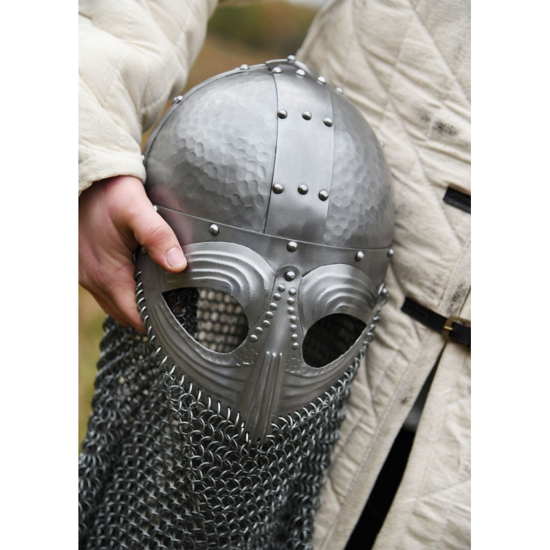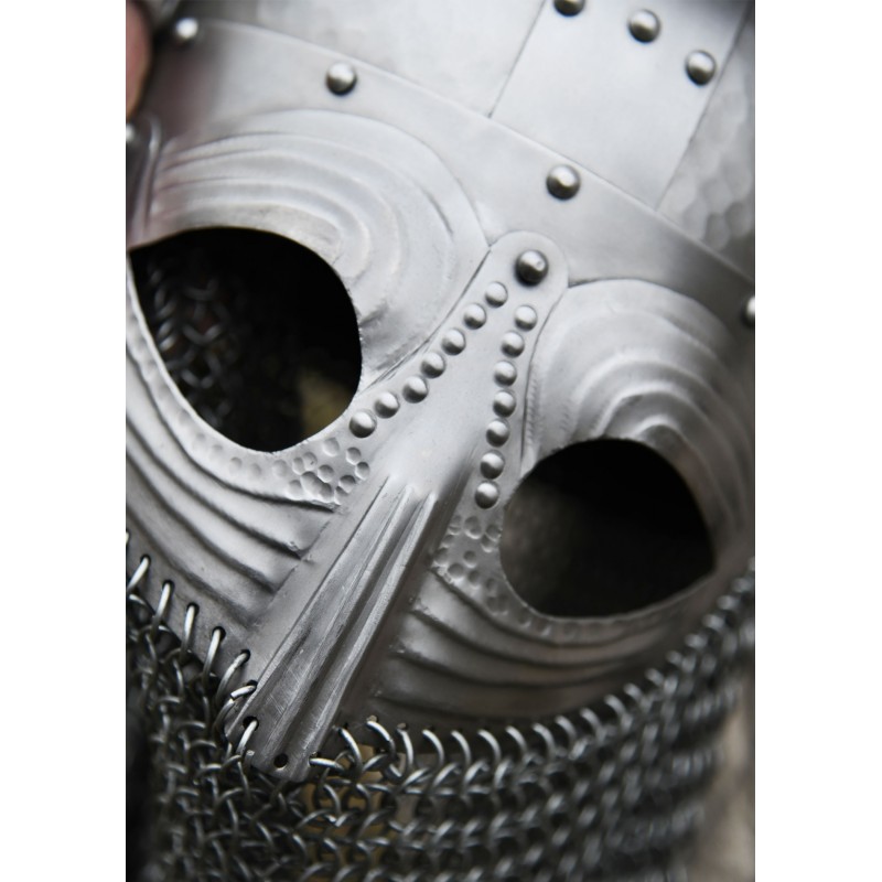 O capacete Vendel com avental de cota de malha em aço de 1,2 mm é uma peça elegante inspirada nos capacetes nasais medievais e da Era Viking. Com design de bandas cruzadas típico dos spangenhelms e guarda facial tipo óculos, proporciona defesa robusta com um toque histórico autêntico.