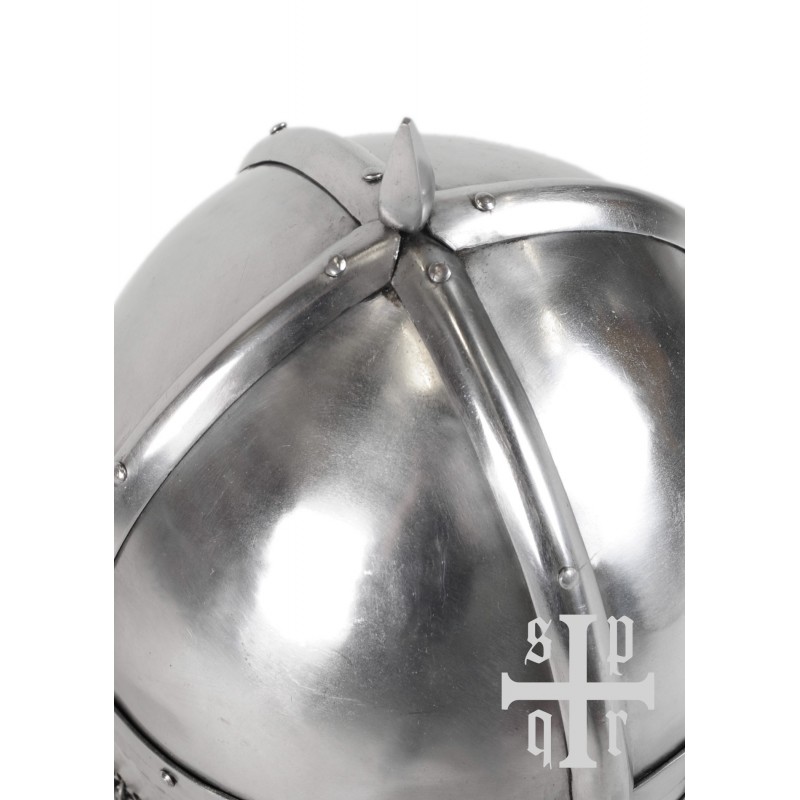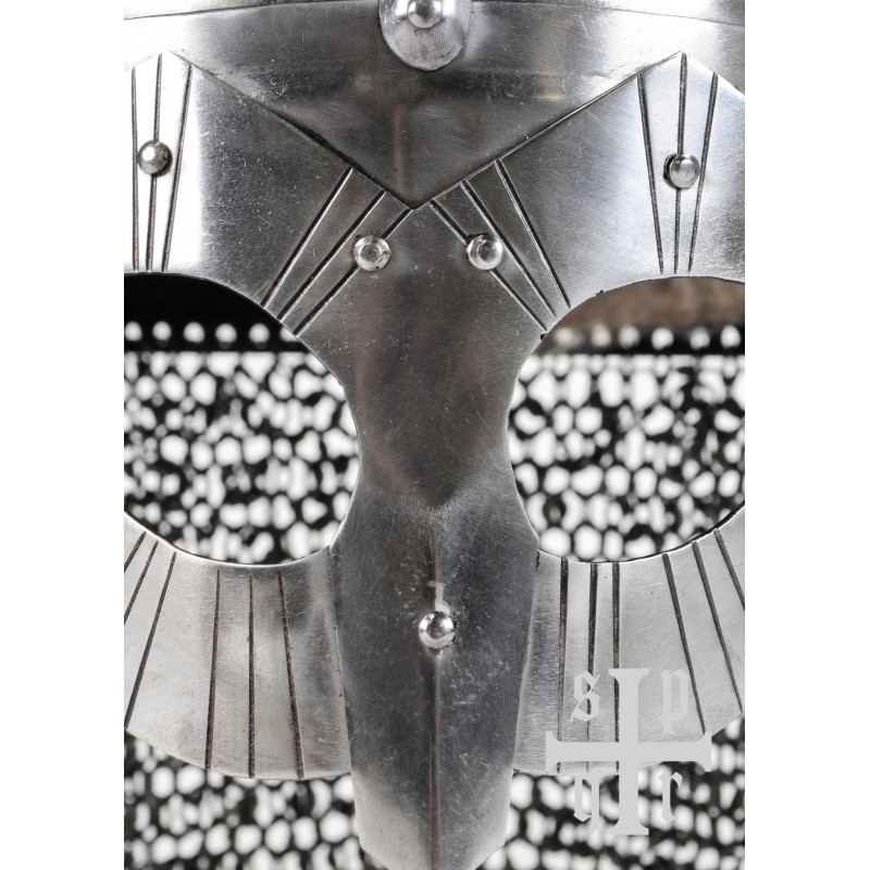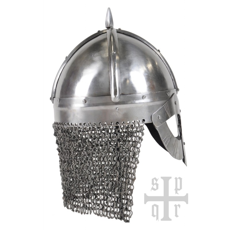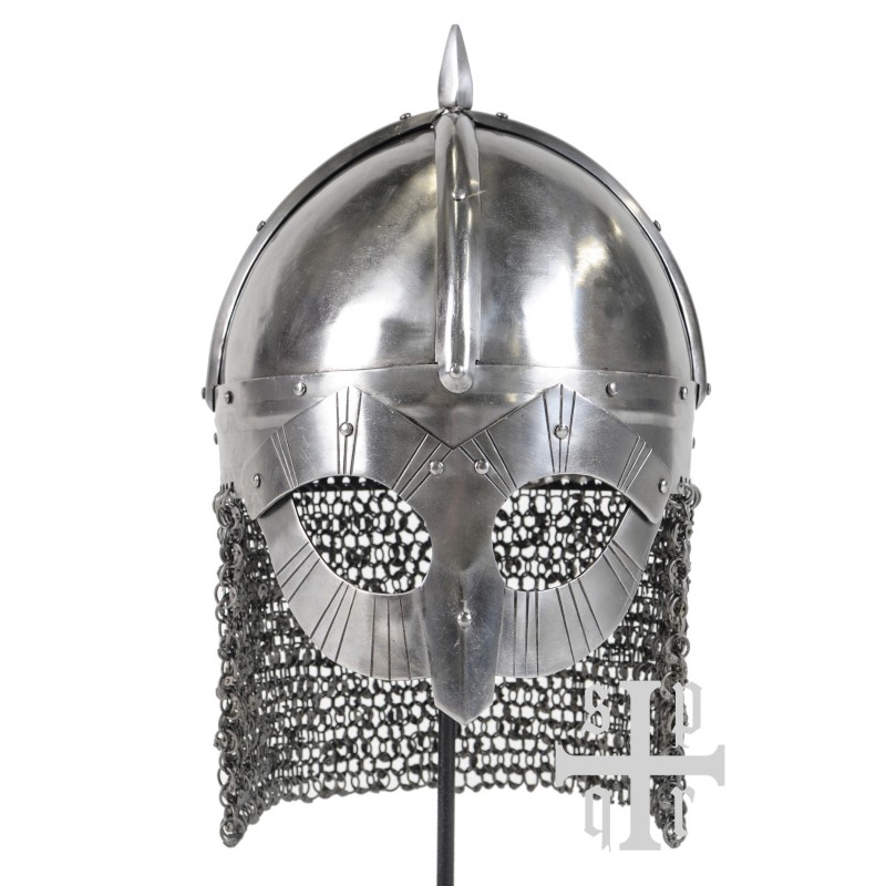 Este capacete viking com proteção facial tipo óculos e camail de cota de malha é uma reconstrução fiel de um achado arqueológico em Gjermundbu, Noruega. Forjado à mão em aço de 1,6 mm, possui interior enegrecido com forro de couro e cinta de queixo de couro de 1,5 mm. O camail de cota de malha é composto por anéis de aço de 1,2 mm, oferecendo proteção adicional ao pescoço.