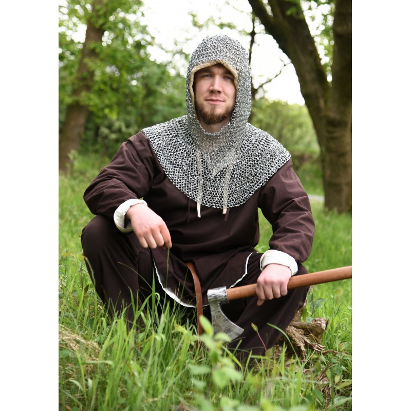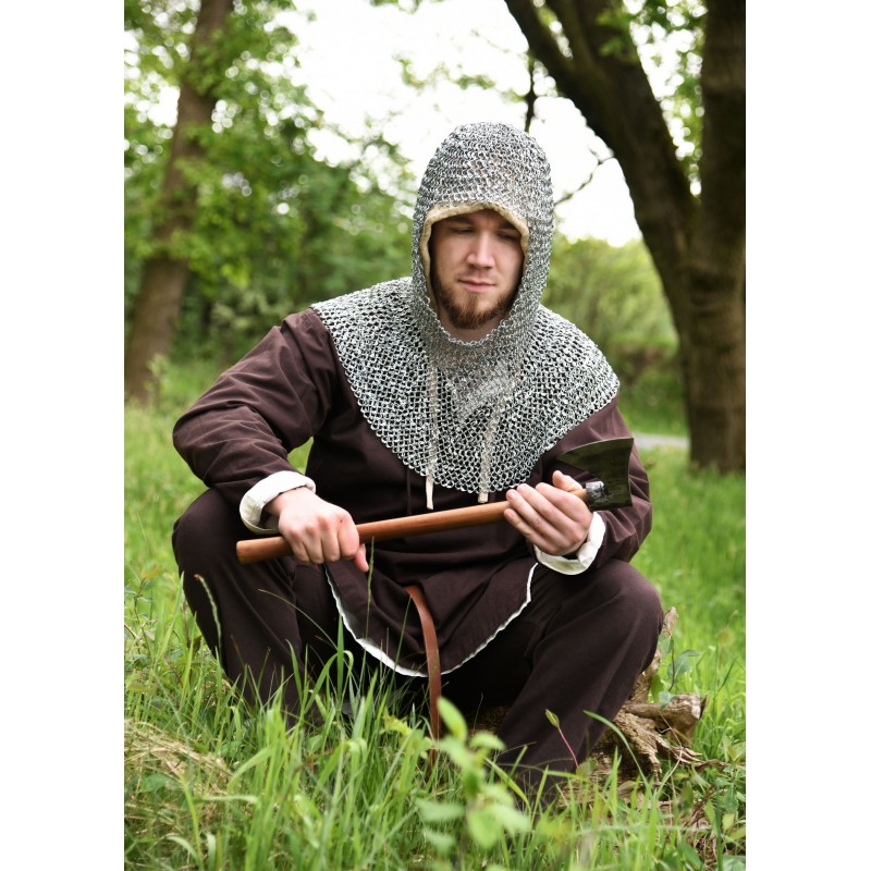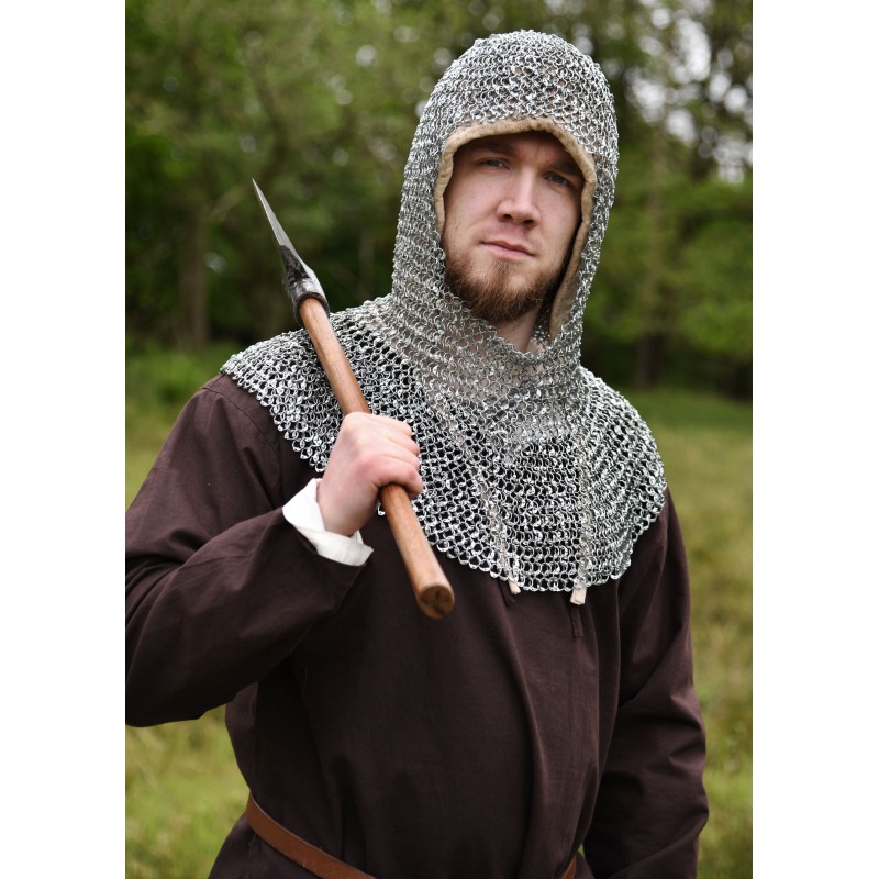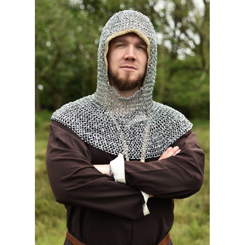 Projetada para cobrir completamente o pescoço e os ombros, esta coifa apresenta uma abertura facial quadrada que mantém o estilo medieval autêntico. Recomenda-se o uso de um gorro acolchoado por baixo para maior conforto.