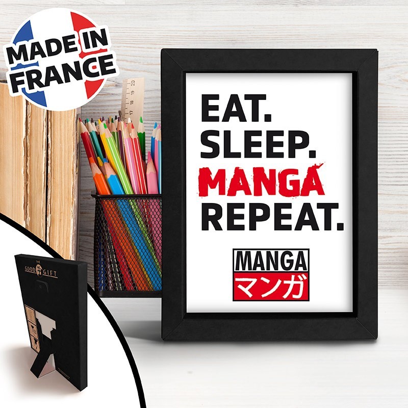 Esta moldura preta Kraft apresenta a frase marcante 'Eat Sleep Manga Repeat' em um estilo moderno e minimalista. Fabricada na França, oferece um design elegante que complementa perfeitamente a decoração de qualquer fã de manga. É um produto de licença oficial, garantindo autenticidade e qualidade. Ideal como presente original para entusiastas de manga ou como um toque pessoal para o seu espaço.