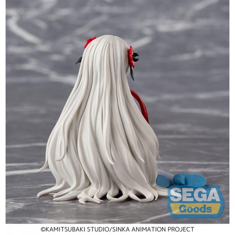 Esta estátua retrata Sekai Yorukawa em uma pose sentada, usando um elegante vestido branco com detalhes pretos e ostentando longos cabelos prateados com mechas vermelhas marcantes e acessórios florais vermelhos e pretos. A figura repousa sobre uma base para estabilidade, perfeita para exibir em qualquer prateleira ou vitrine.