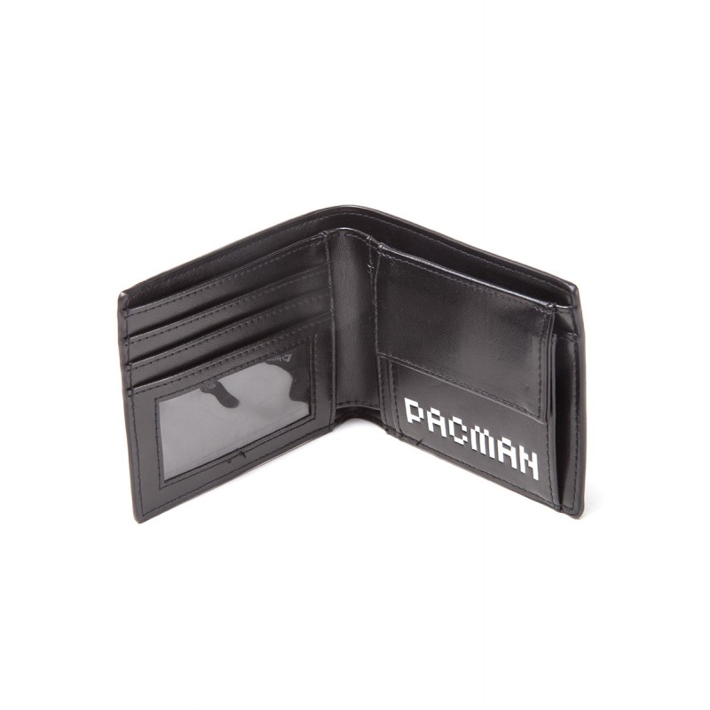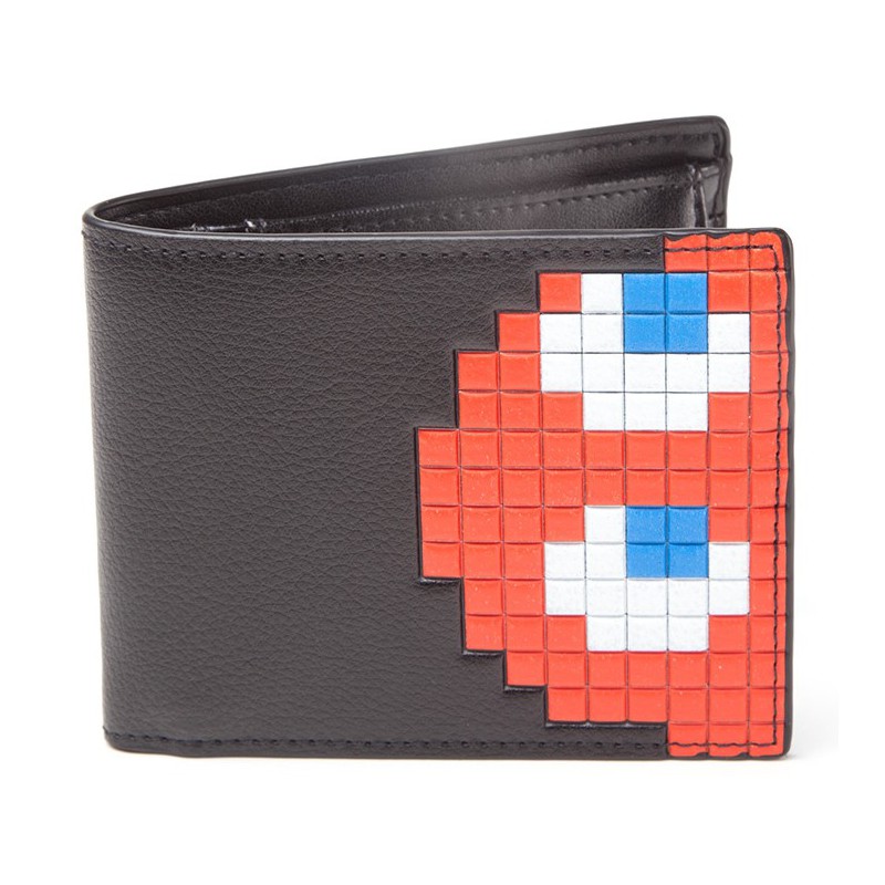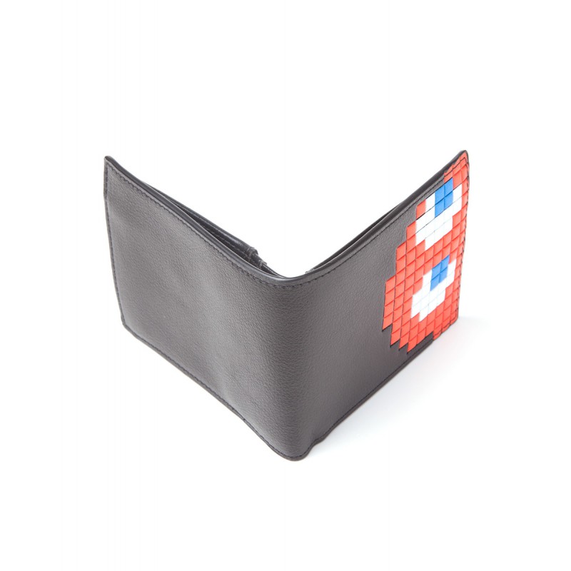 Una cartera genial la mires por donde la mires!! Por fuera tiene un gráfico genial del fantasma rojo o Blinky del popular videojuego con Pac-Man construido con pixeles rojos sobre un elegante fondo negro. Y por dentro es también genial! Tienes un montón de compartimentos para que lleves tus cosas bien ordenadas.